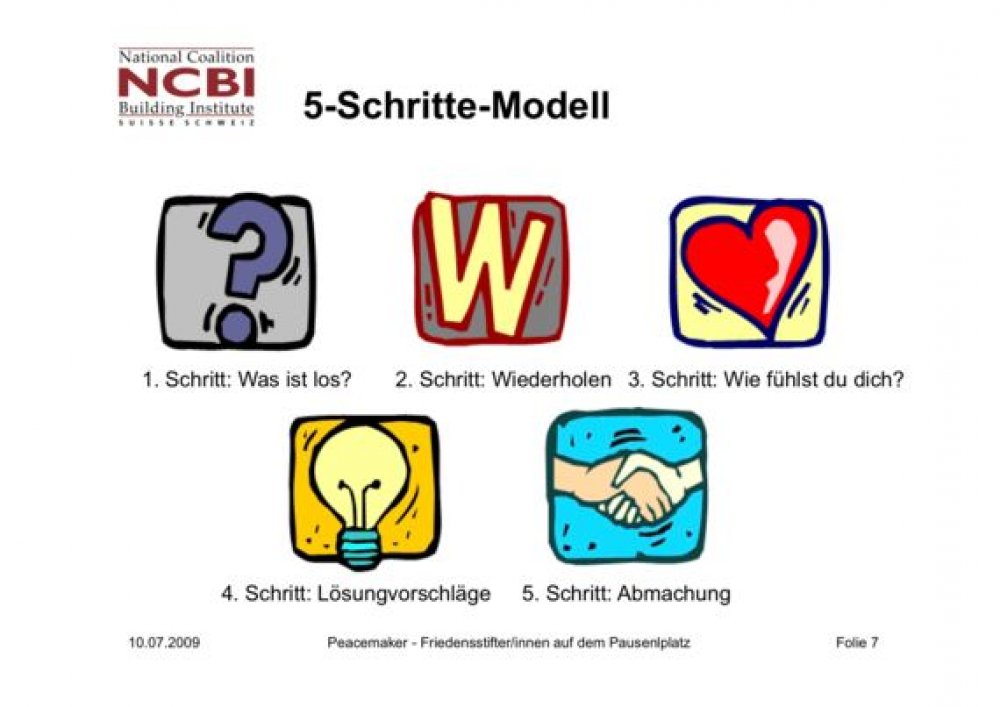 Mit dem Projekt "Peacemaker" setzt sich die ganze Schule regelmässig mit dem Thema "Frieden" auseinander. Dadurch sensibilisieren wir den Umgang mit Konflikten und üben mit den Schülerinnen und Schülern eine gewaltlose Konfliktlösung mit dem 5-Schritte-Modell nach NCBI.