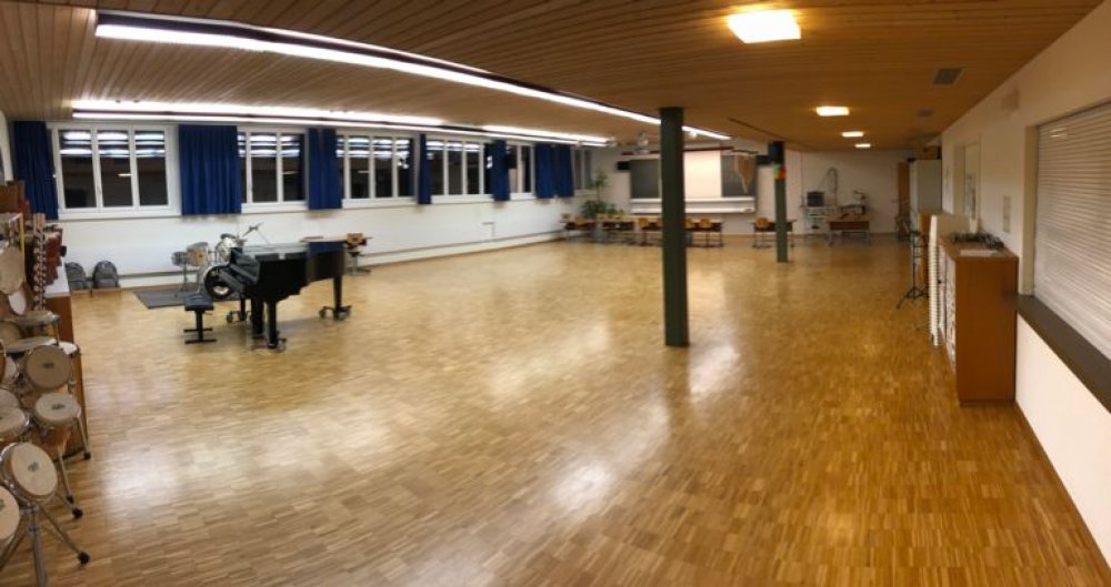 Wenn Sie aber beim Haupteingang die Treppe hinuntergehen, kommen Sie an den Werkräumen vorbei zum Singsaal. Hier wird nicht nur gesungen, dieser Raum ist sozusagen der Raum für alle Fälle. So finden auch immer wieder abends Veranstaltungen statt oder die Musikschüler versuchen mit mehr oder weniger Erfolg einem Instrument wohlklingende Töne zu entlocken.